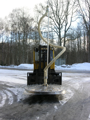 Efter allt svetsningsarbete och böjning av den massiva aluminiunstången, börjar pådragning av repet som var en del av arbete för att sedan lägga på reprullen...